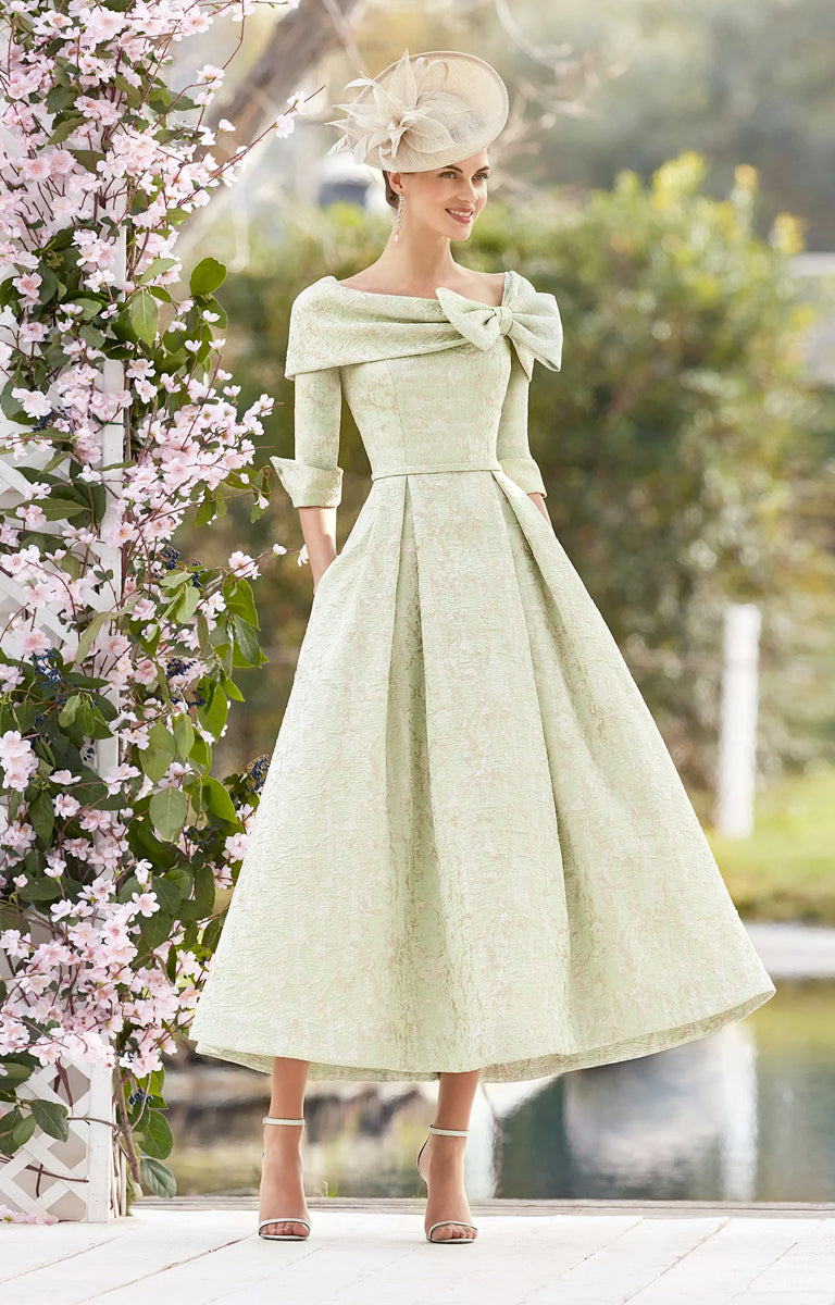 • A woman wearing an ivory bodice mother of the bride or groom dress by Condici with a bow detail on the chest and a contrasting marble mist trim, paired with a matching hat. A woman wearing an ivory bodice mother of the bride or groom dress by Condici with a bow detail on the chest and a contrasting marble mist trim, paired with a matching hat.